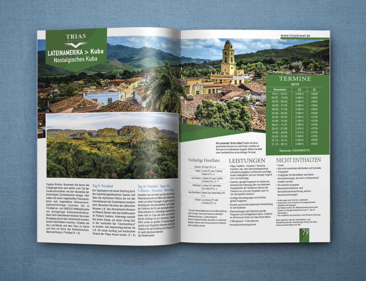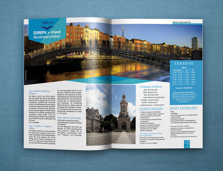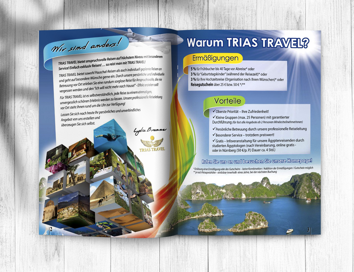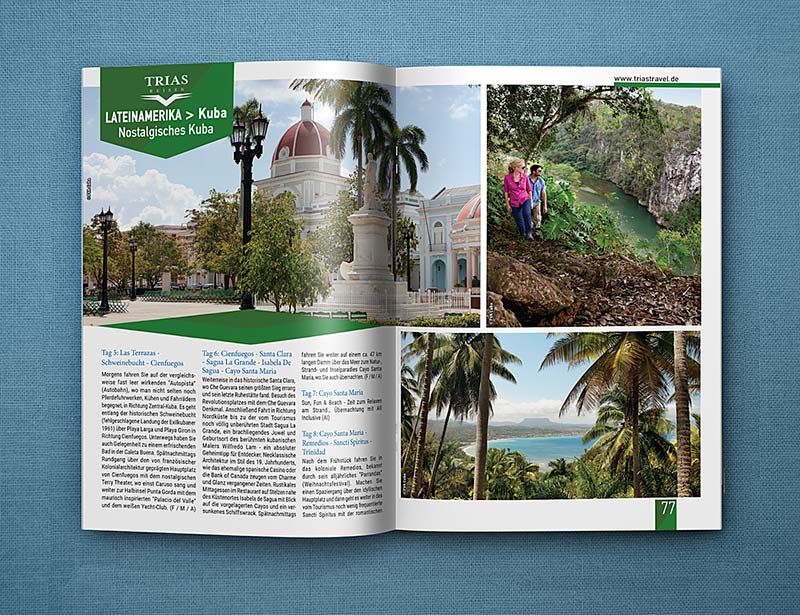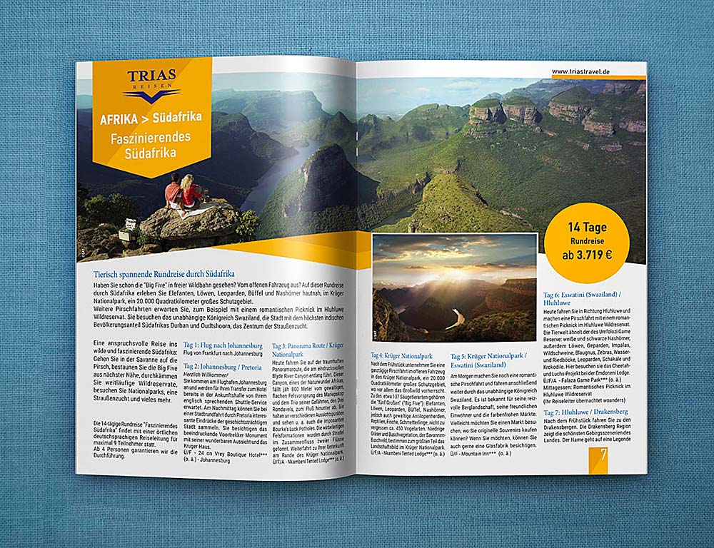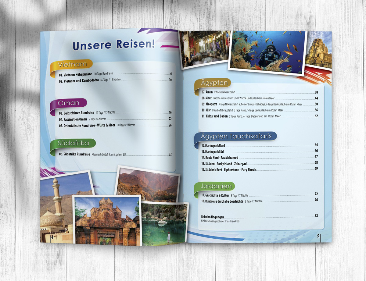 Το τουριστικό γραφείο Trias Travel με έδρα στην Γερμανία μας ανέθεσε τον σχεδιασμό τον ετήσιων καταλόγων με τα ταξίδια που διοργανώνει σε χώρες της Αφρικής, της Ασίας και της Λ. Αμερικής.